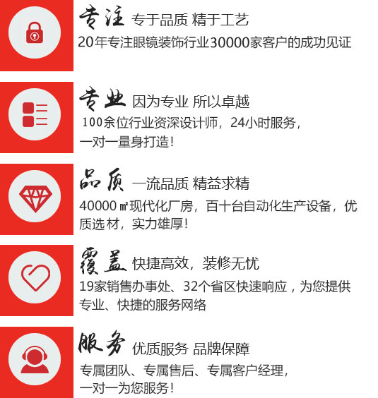 陽光視線是一家集設(shè)計(jì)、研發(fā)、生產(chǎn)、安裝、施工為一體的綜合性企業(yè)!20年專注服務(wù)于眼鏡行業(yè),擁有19個(gè)銷售網(wǎng)點(diǎn),遍布32個(gè)省份;500多名員工,其中設(shè)計(jì)研發(fā)、工程安裝、管理、營銷、等中高級(jí)執(zhí)行人才160余名;2000平米的辦公環(huán)境;公司研發(fā)能力強(qiáng),并能迅速將研發(fā)成果轉(zhuǎn)化為生產(chǎn)與商業(yè)效益;擁有超具規(guī)模的展柜生產(chǎn)基地、生產(chǎn)流程、工藝技術(shù)以及生產(chǎn)設(shè)備。